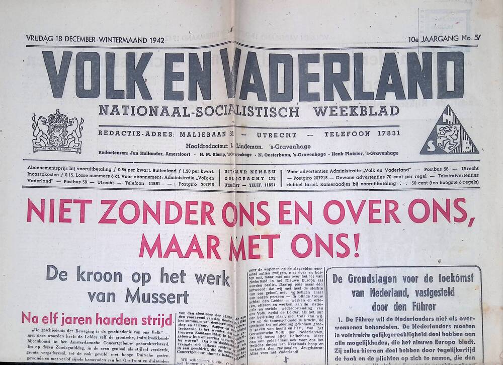 Volk en Vaderland, jaargang 1942: 4 december.Weekblad voor de Nationaal-socialistische Beweging in Nederland. Volk en Vaderland was van 1933 tot 1945 het weekblad van de (NSB). Het verscheen in het formaat van een krant en het was propagandistisch van inhoud.10e jaargang no 49.De tragedie van het negativisme. Ook Frankrijk moet het gelag van haar vorig regiem betalen.