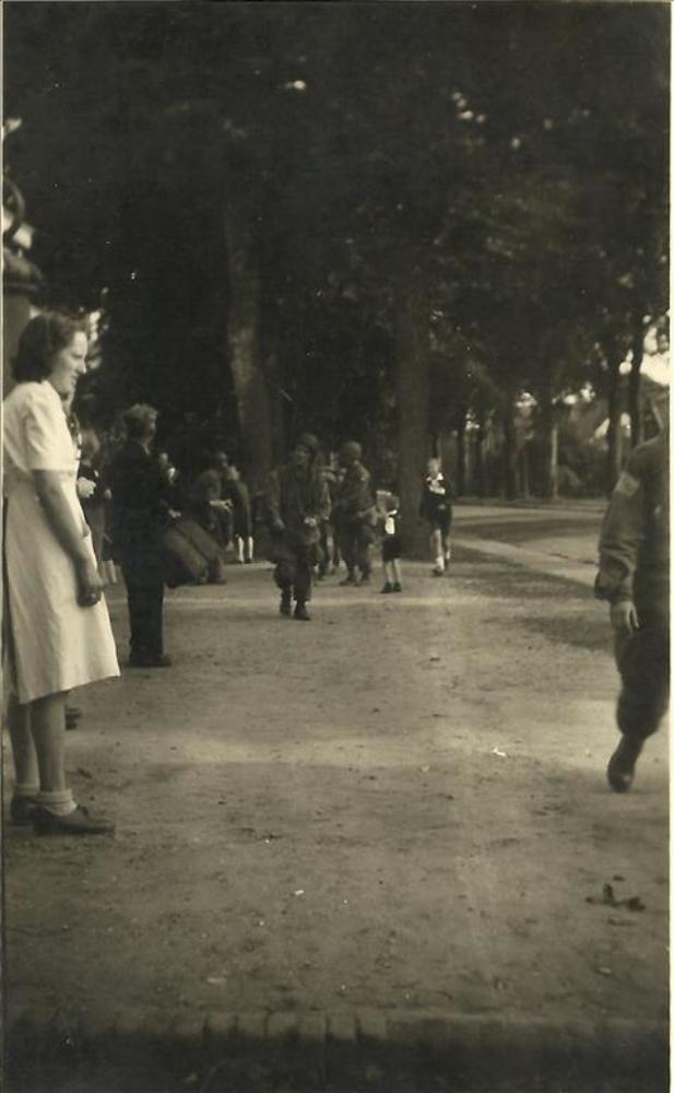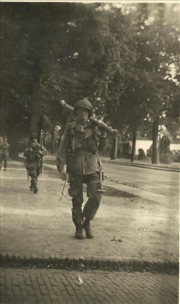 19 September 1944, Groesbeekseweg, Nijmegen Voorbij lopende Amerikaanse militairen van de 82nd AB Division