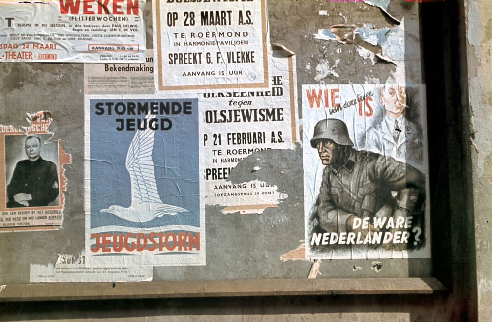 Plakkaten; 'Jeugdstorm' en 'Wie van de twee is de ware Nederlander'. Links Mussert.