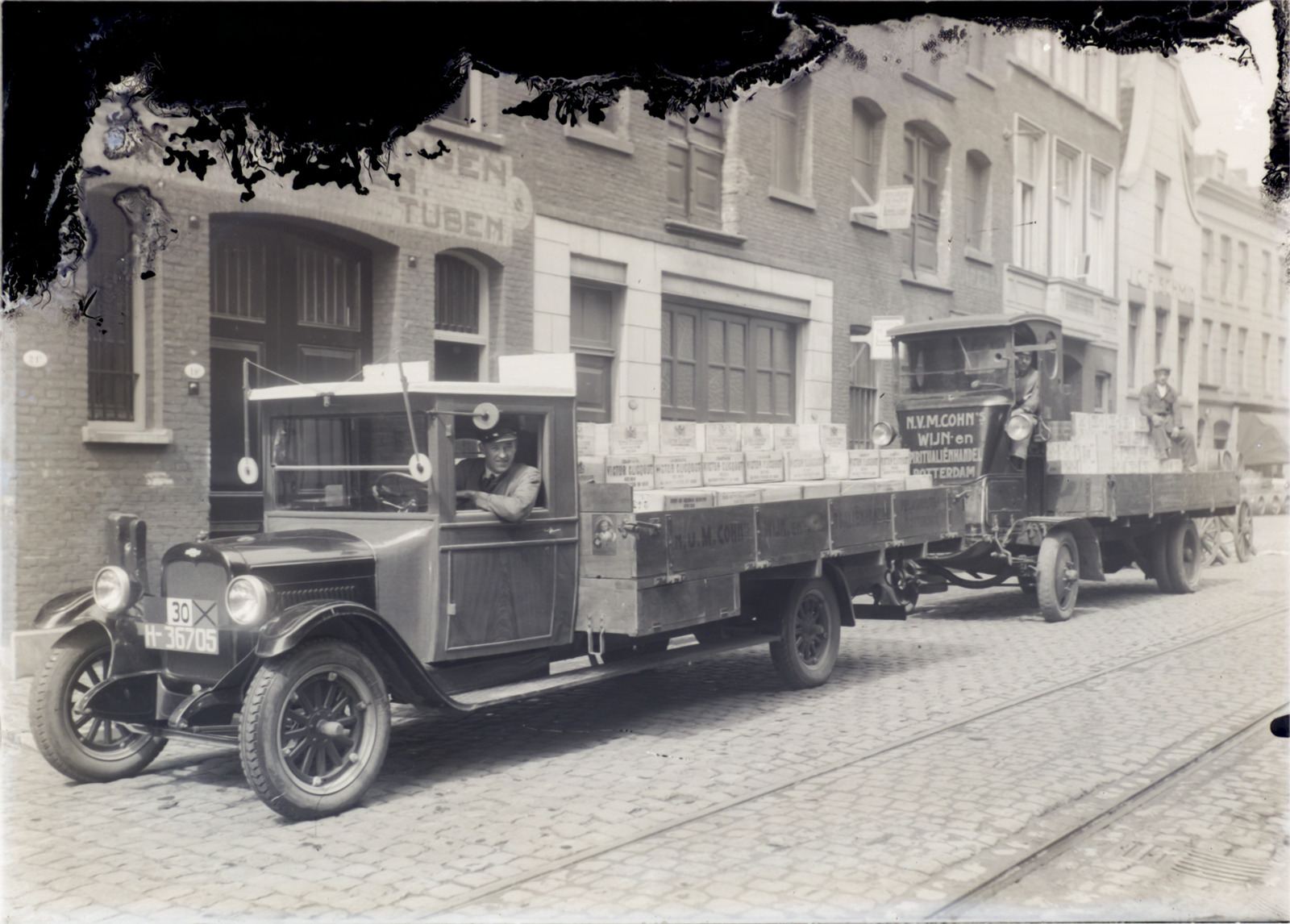 Straatgezicht in de Pelikaanstraat in Rotterdam. Voor het magazijn van Cohn's Wijnhandel op huisnr.