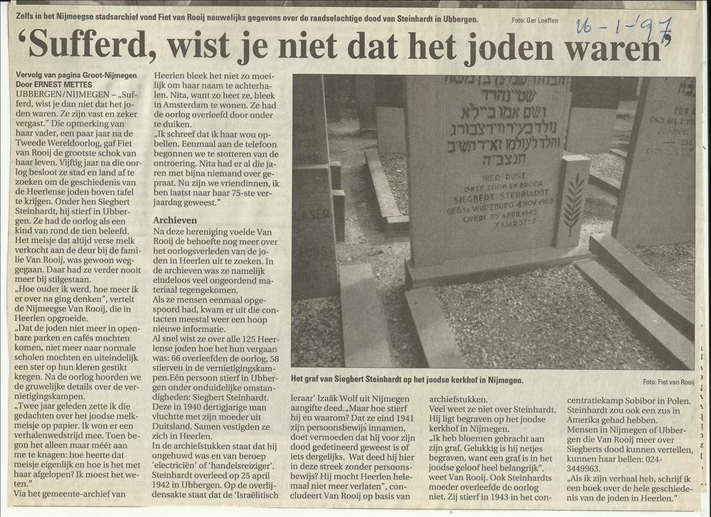 Sufferd, wist je niet dat het Joden waren "zelfs in het Nijmeegse stadsarchief vond Fiet van Rooij nauwelijks gegevens over de raadselachtige dood van Steinhardt in Ubbergen" "16 januari 1997"