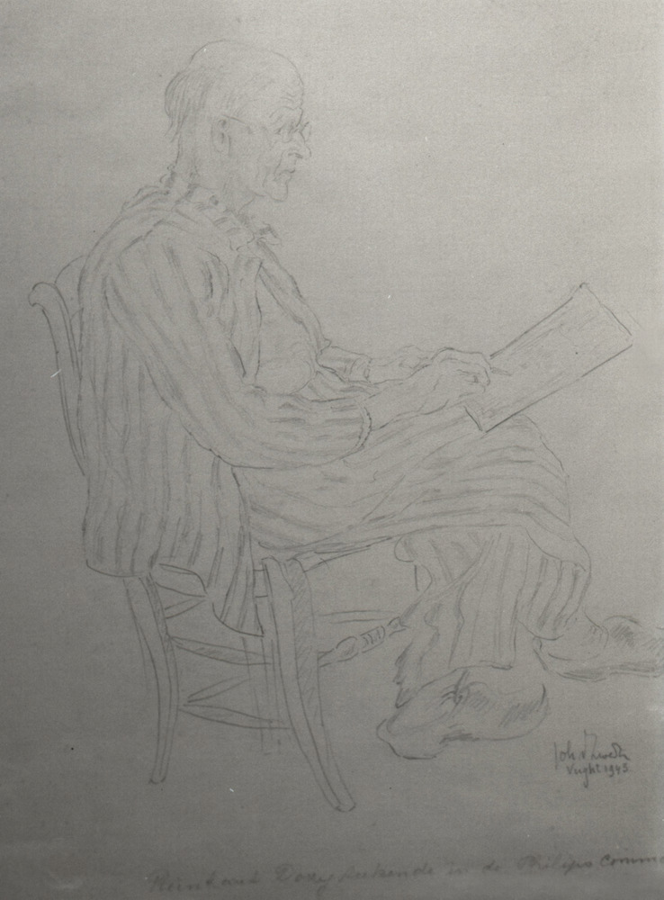 Foto van een tekening van een oudere man in een gevangenen uniform in kamp Vught.