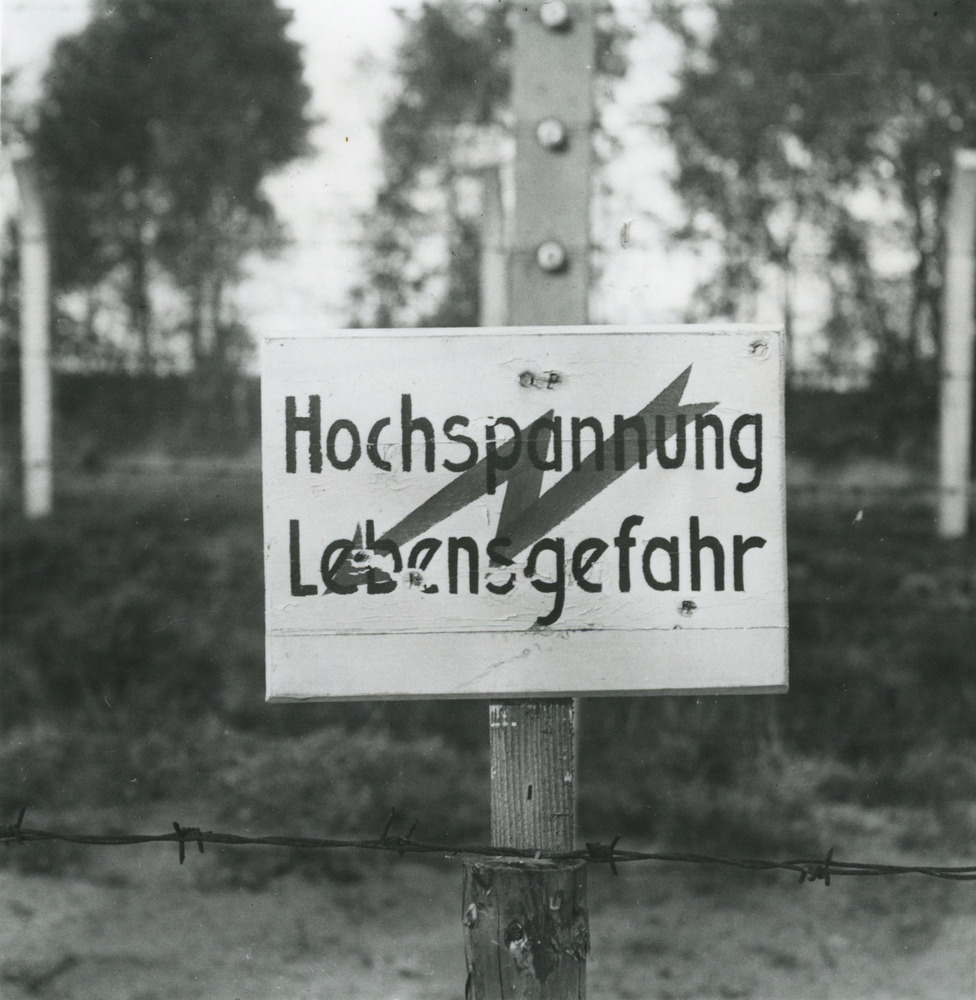 Foto uit een reeks van 69 foto's van Nationaal Monument Kamp Vught. Hoogspanningsbord.