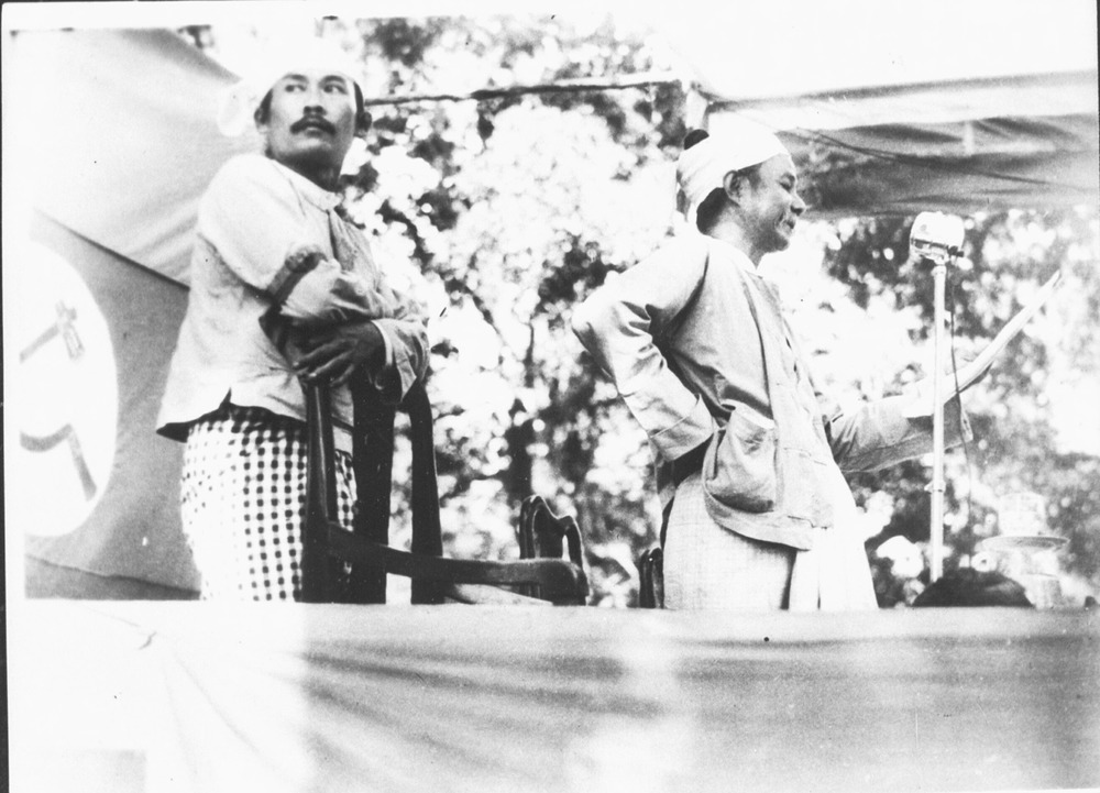 Links: Teik Tin Kodawgyi, president van de Burmese Nationale Parij en Thakin Kodaw Mhine, een Burmees geleerde tijdens e...