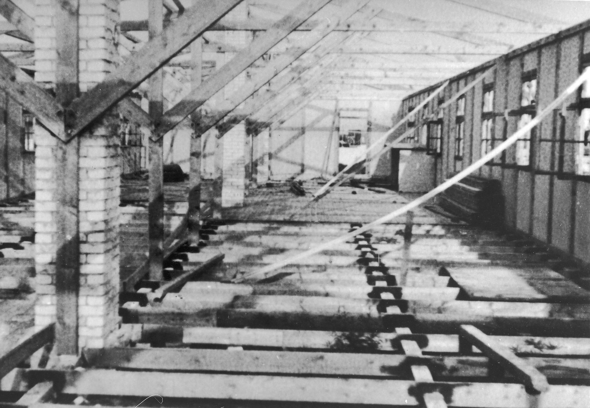 van barakken van het kamp met op de achtergrond de schoorsteen van het ketelhuis