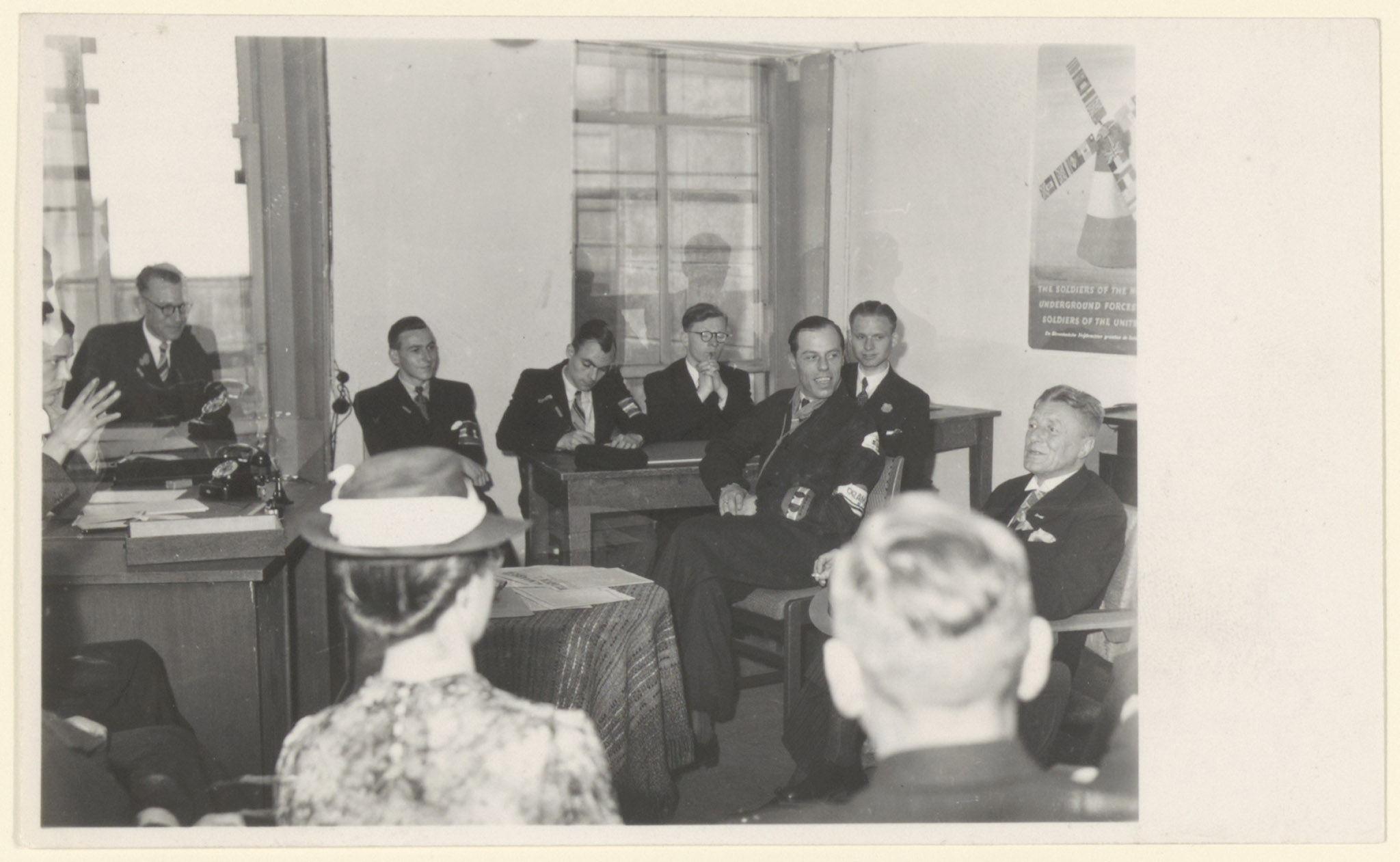 Stafleden van de Binnenlandse Strijdkrachten tijdens een bespreking in het stadhuis.