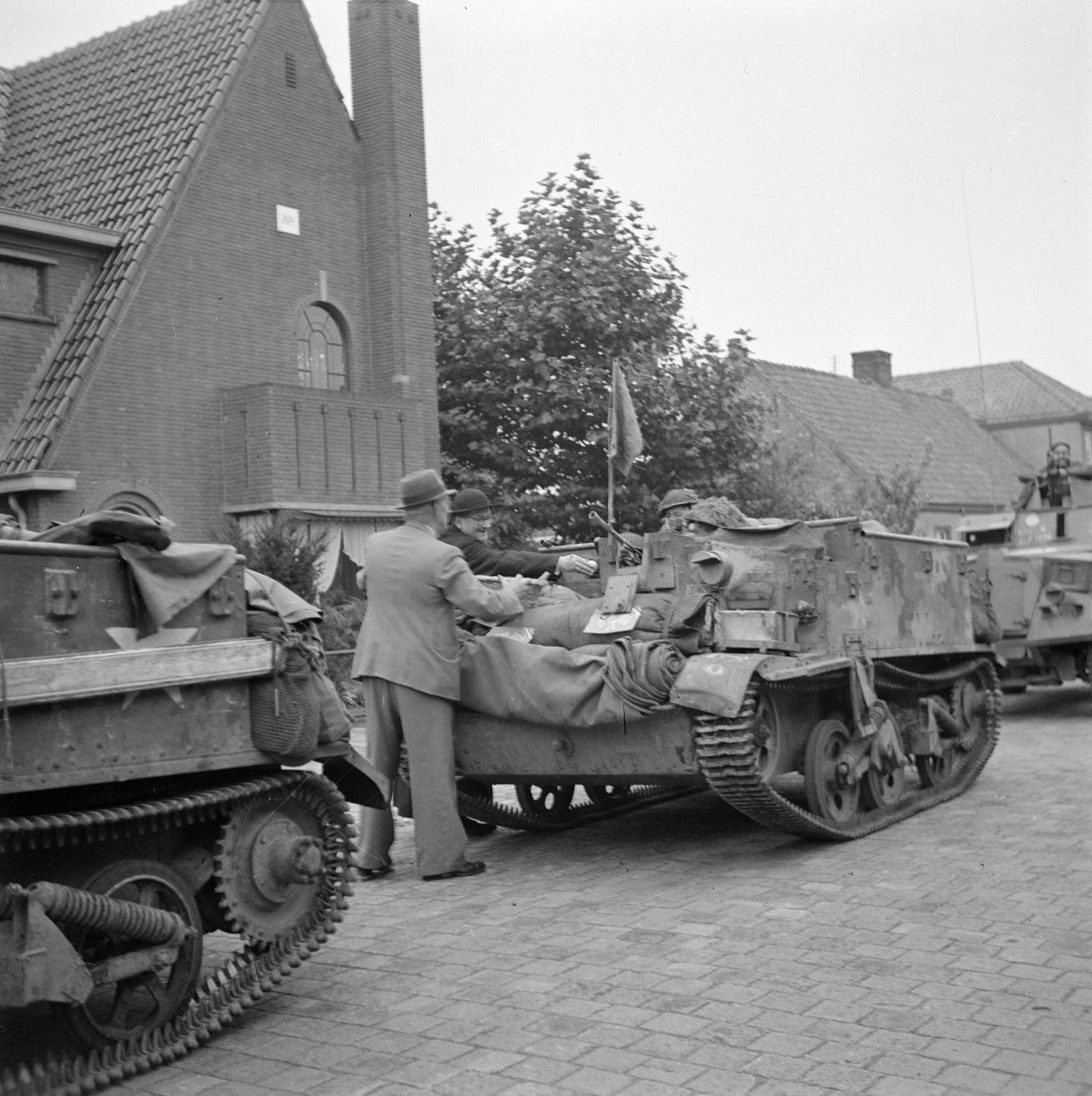 Burgers en pastoor delen bij de bevrijding fruit uit aan militairen in pantservoertuig, vermoedelijk militairen van de Irish Guard ...