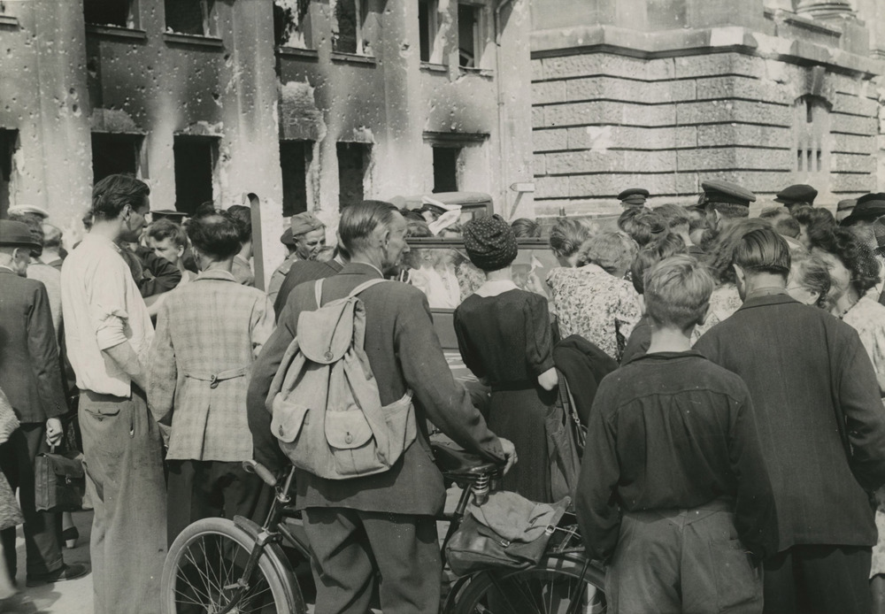 ' The huge crowd that gathered around an American jeep next to the Reichstag, when it became known that the soldiers wer...