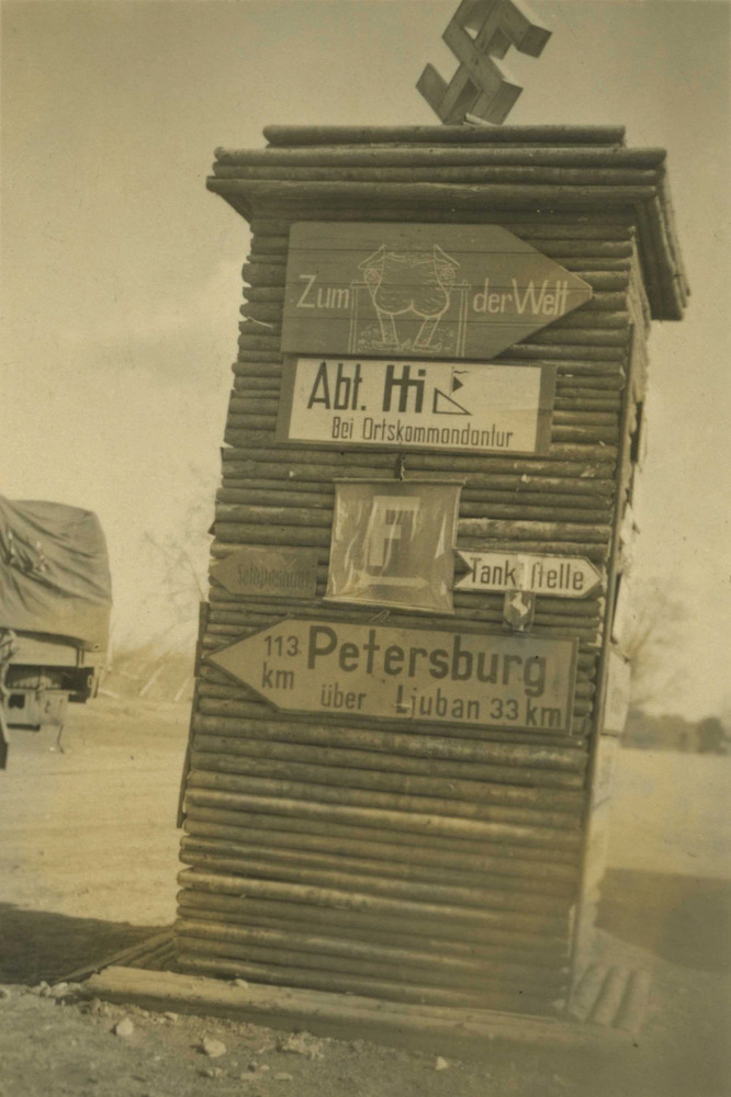 Een van hout getimmerde zuil met daarop divers wegwijzers. St Petersburg, 113 km., via Ljuban 33 km.
