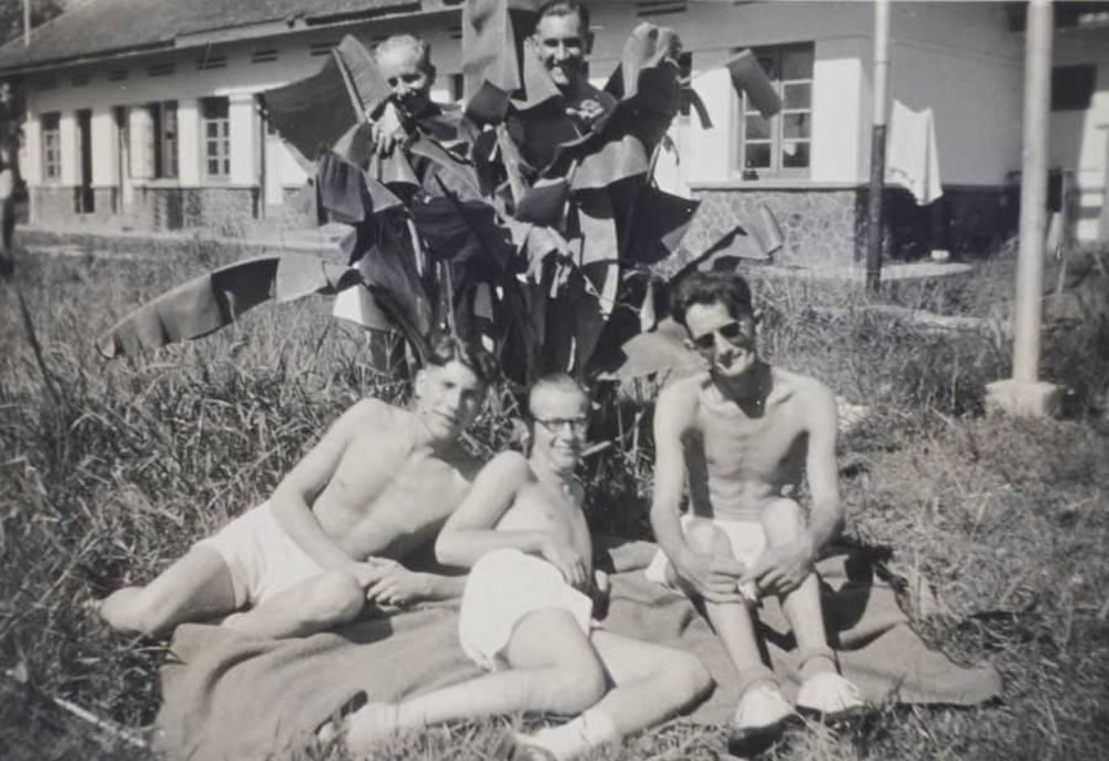 Groepsportret van vijf Nederlandse militairen voor een barak; drie in korte broek op een deken, twee half verscholen ach...
