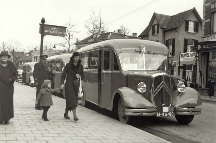 Kerklaan met bushalte van de stadsdienst Robart (Citroën bus), Links op de stoep controleur Onderstal.