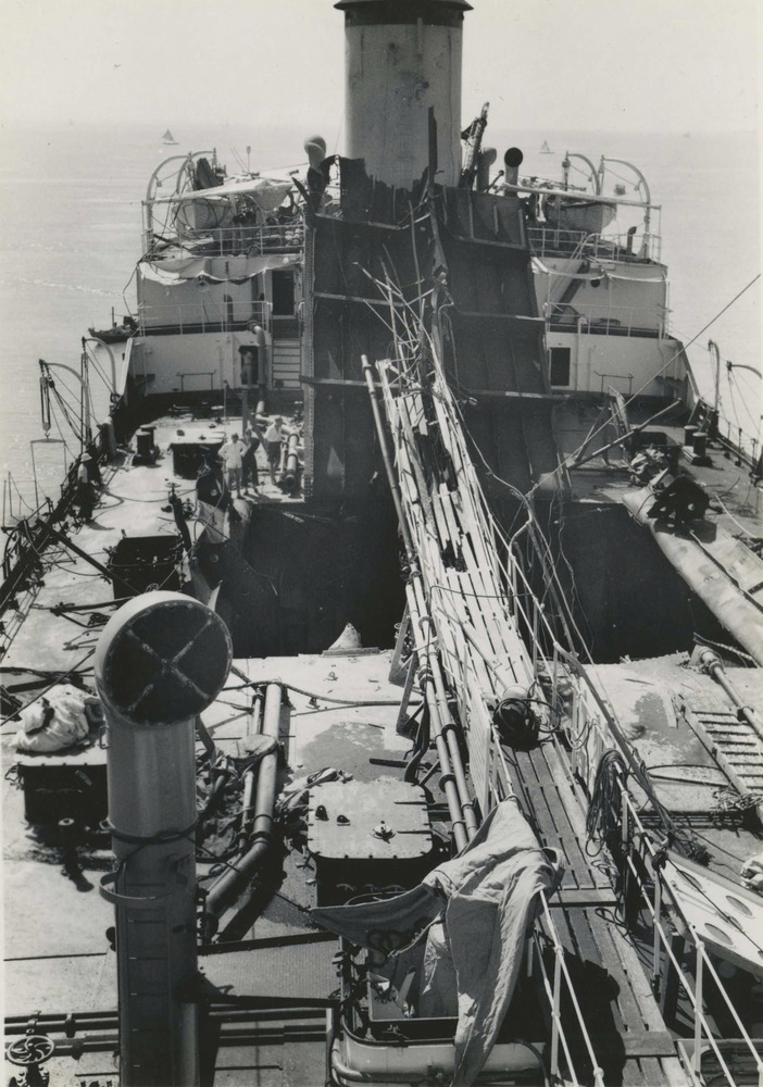 De gebombardeerde Nederlandse motortanker mt 'Manvantara' Schade, veroorzaakt door een bombardements aanval op het schip...