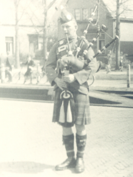 Canadeese doedelzakspeler (piper) van de Scottish Highlanders, bij de viering van de bevrijding.