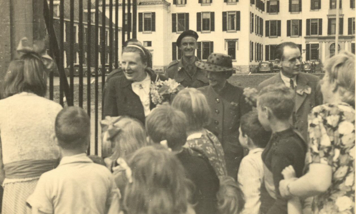 Prinses Juliana begroet kinderen bij het hek van het paleis.