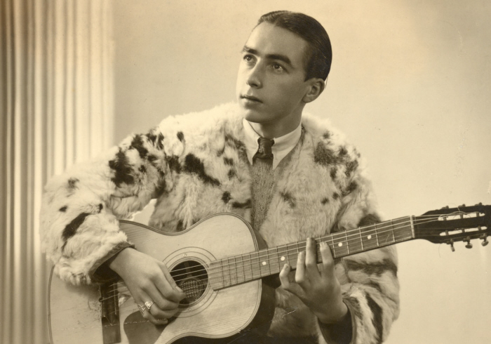 Johan Ribbink met zelfgemaakte elektrische gitaar en jasje van konijnenbont.