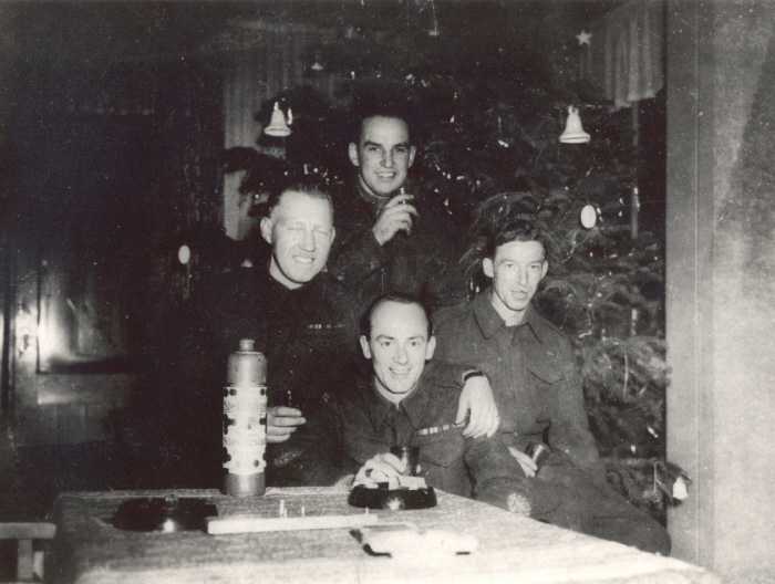 Deze militairen hebben voor hun kerstfeest een fles Duitse Schnapps (Steinhäger) buitgemaakt.
