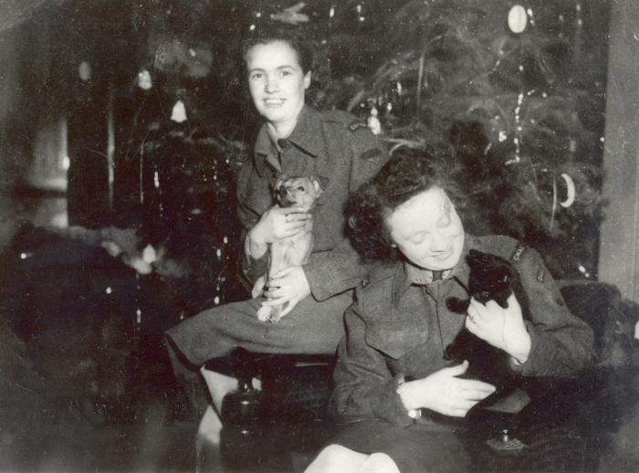 Vrouwelijke Canadese militairen vieren kerstmis bij iemand thuis. Ook huisdieren ontbreken niet.