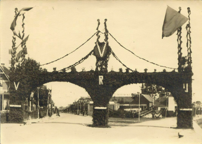 Erepoort in de Kerkweg, ter gelegenheid van de Bevrijding in 1945. Links de boerderij van G.Woudenberg, rechts bakkerij Frederiks. ...