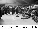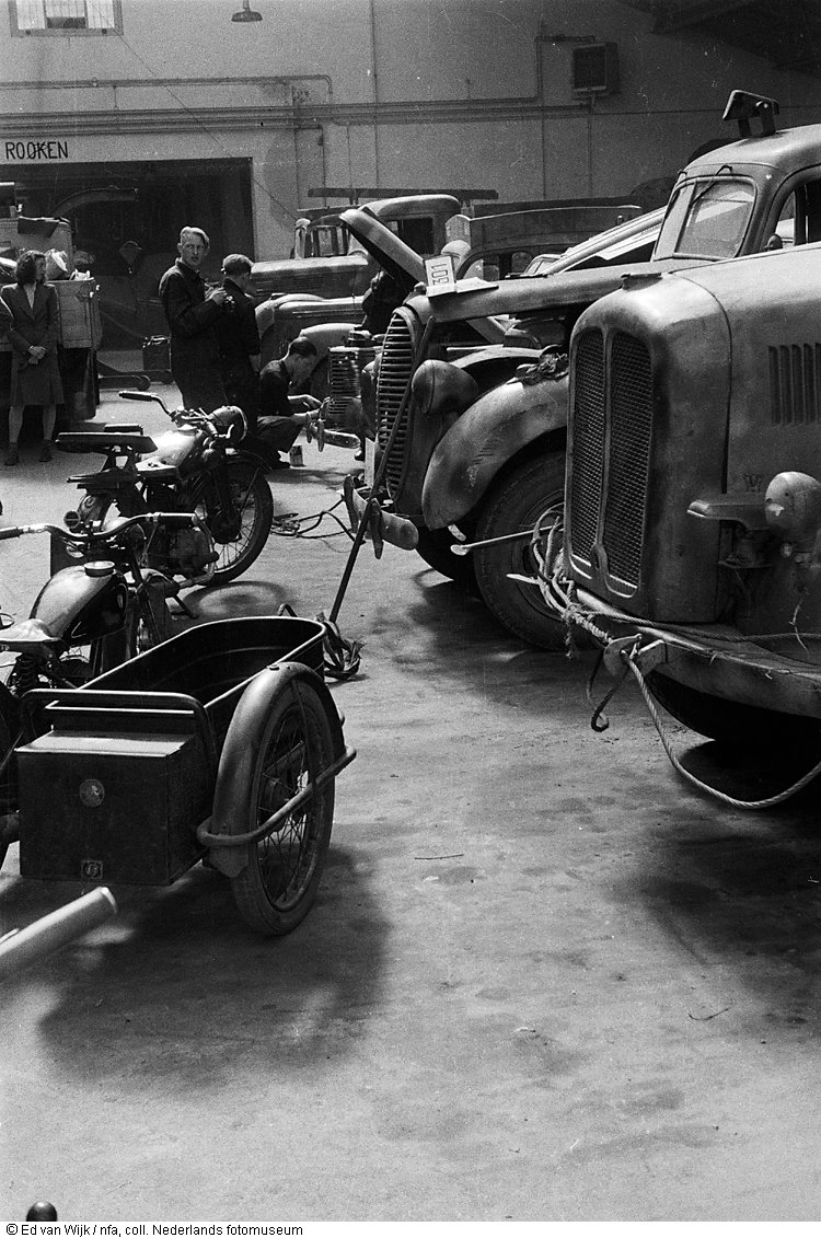 Geallieerden bekijken achtergelaten auto's in een garage van de nazi's, Den Haag (mei 1945)