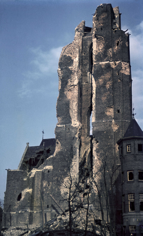 De zwaar verwoeste toren van de kathedraal. St. Christoffelkathedraal, Roermond