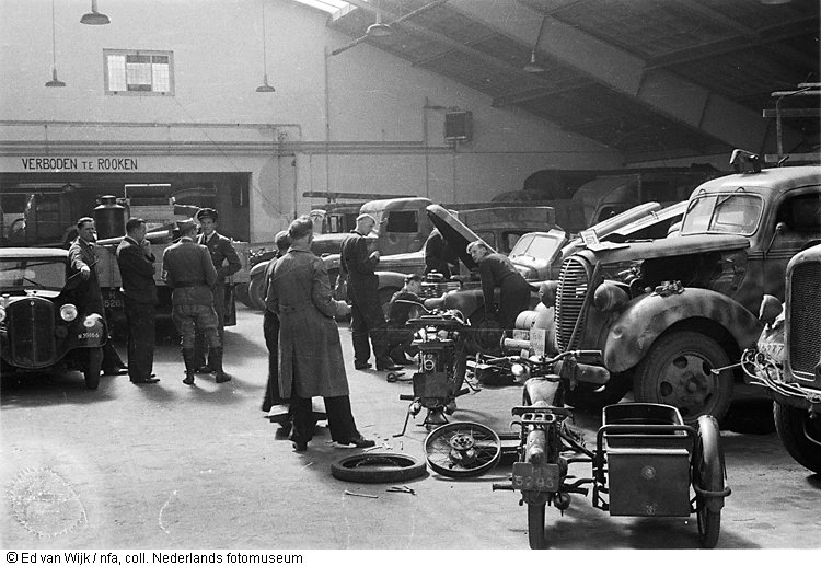 Geallieerden bekijken achtergelaten auto's in een garage van de nazi's, Den Haag (mei 1945)