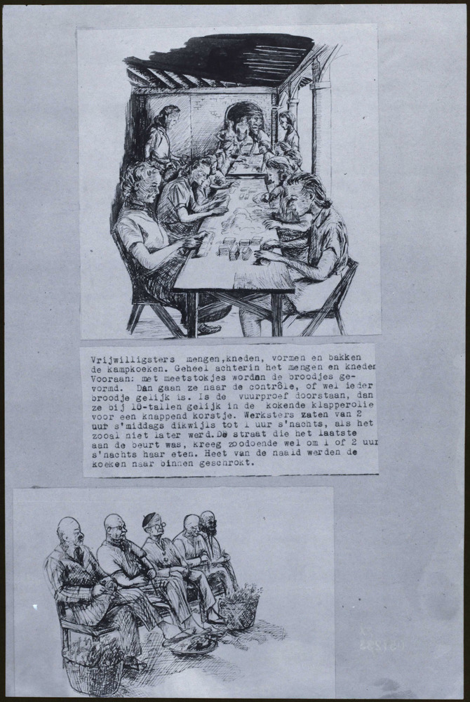 `Vrijwlligersters mengen, kneden, vormen en bakken de kampkoeken'; mannen op een bank.