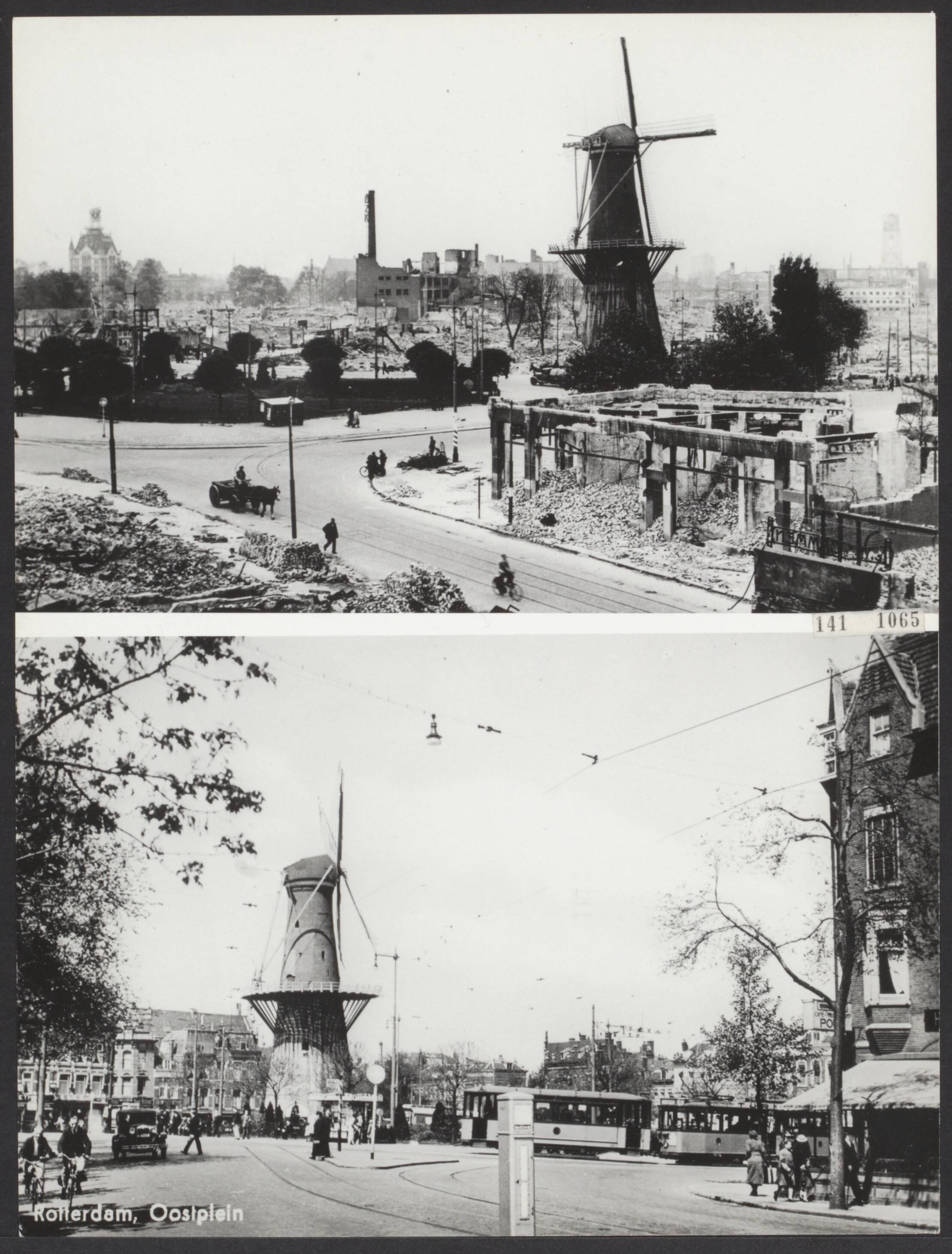 Oostplein. Wonderlijk bleef de oude molen gespaard tussen de ruïnes