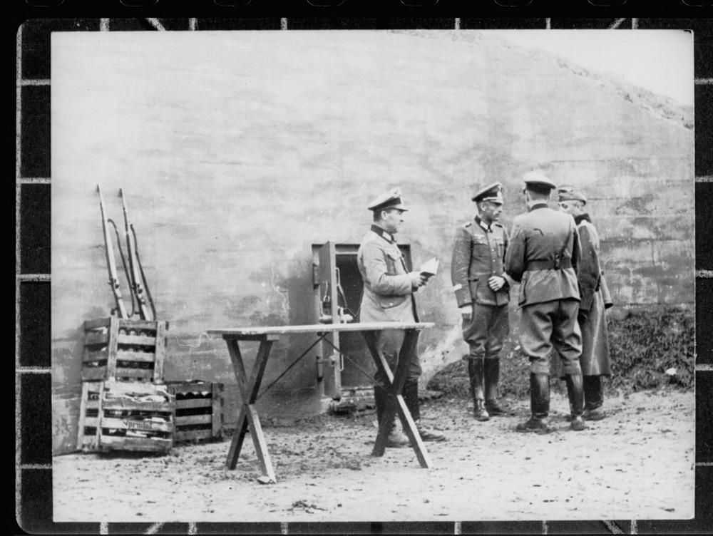 Talking war strategy! German officers discuss the situation in front of a Siegried line bunker of a German batallion.