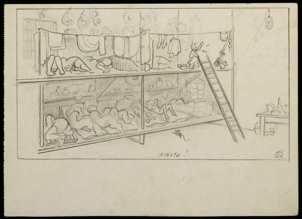 `Siësta!' Deel van 3 losse tekeningen, waarschijnlijk als aanvullingen op het plakboek bestaande uit 36 tekeningen, twee...