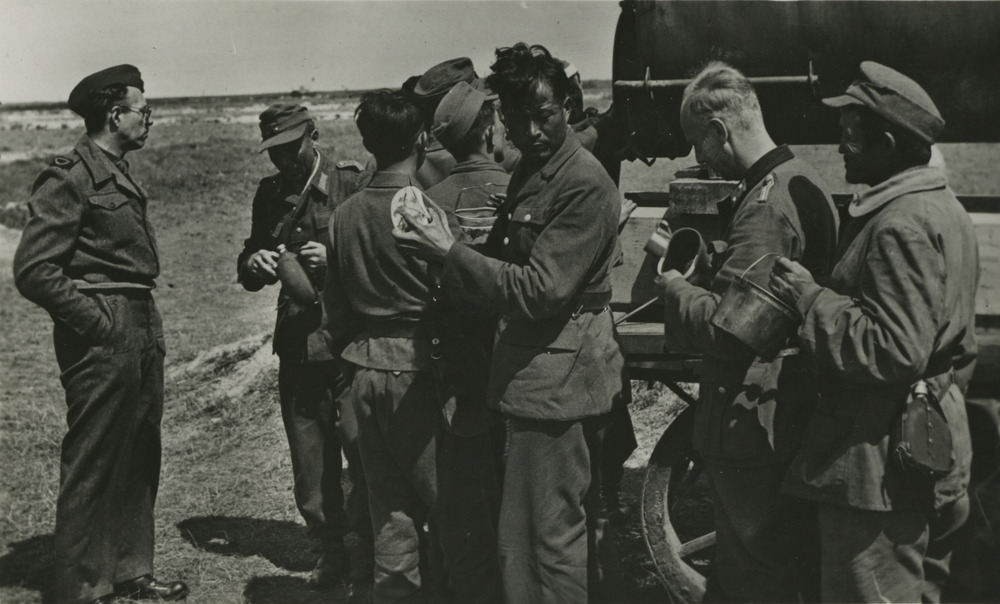 Een geschutscommandant van een zware Duitse Flak batterij op Kreta, rust even uit.