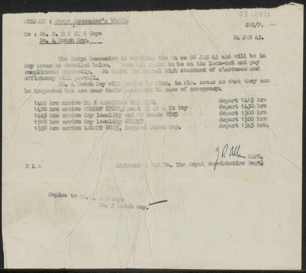 Bericht betreffende bezoek van de Legerkorps commandant op 26 Jan 45, d.d. 24 Jan 45Bericht betreffende bezoek van de Legerkorps commandant op 26 Jan 45, d.d. 24 Jan 45