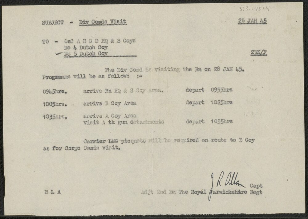 Bericht betreffende bezoek van de Divisie commandant op 28 Jan 45, d.d. 24 Jan 45Bericht betreffende bezoek van de Divisie commandant op 28 Jan 45, d.d. 24 Jan 45