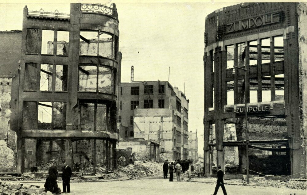 Gebombadeerde huizen in waarschijnlijk de Nassau Dillenburgstraat met rechts het zusterhuis.