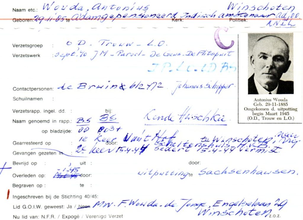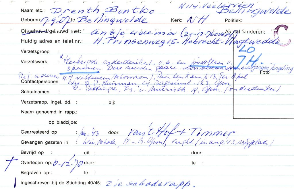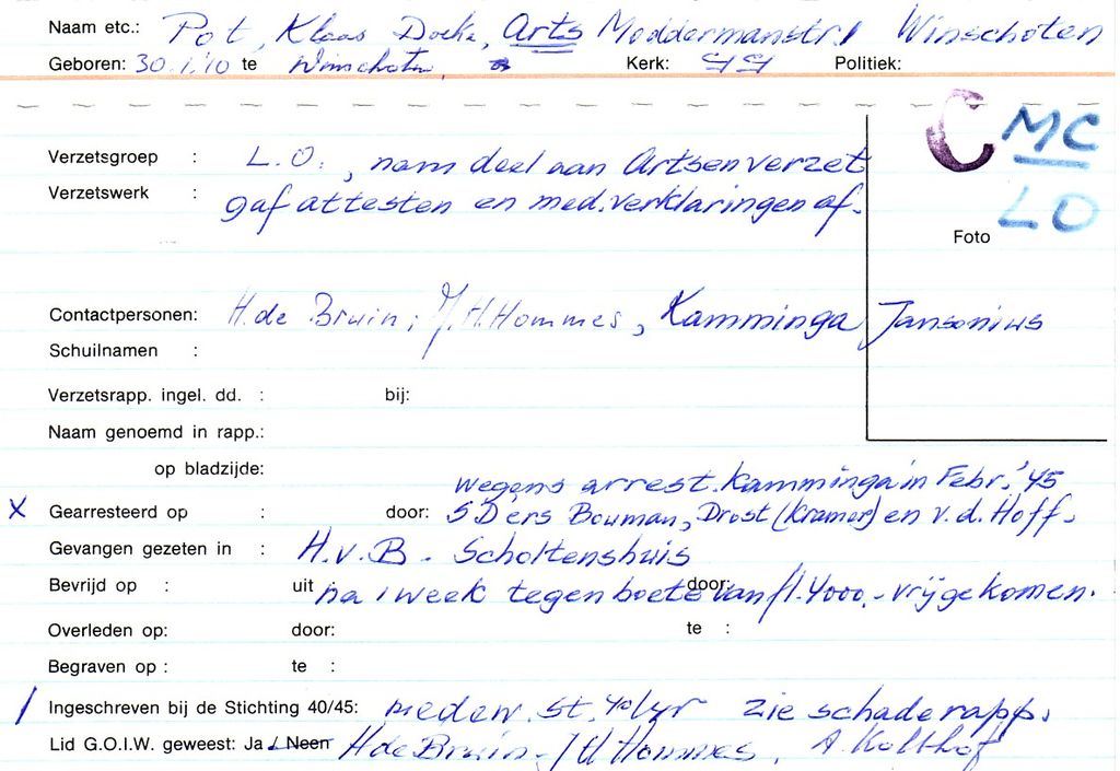 Gearresteerd door de Hollandse SD-er K.C. van den Hof, politiecommandant Winschoten, 24-06-1943. Gevangen gezeten in Winschoten, het Huis van Bewaring Groningen (10 dagen), toen naar Vught [vervolgens St. Michielsgestel, zie het boek Een doodgewone KP'er]. Daaruit vrijgelaten, 22-12-1943