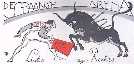Spotprent over de Spaanse burgeroorlog.Op de prent is een ondertitel te lezen: 'O, toreador, wees bij 't gevecht er immer op bedacht: Een zwart oog u bespiedt!'.De spotprent is uitgegeven op 29-02-1936. Tjerk Bottema heeft zijn handtekening links onder gezet.Met arbeiders en SDAP-leden als doelgroep vulde De Notenkraker tussen 1907 en 1936 het dagblad Het Volk aan met vele originele spotprenten. Deze ...