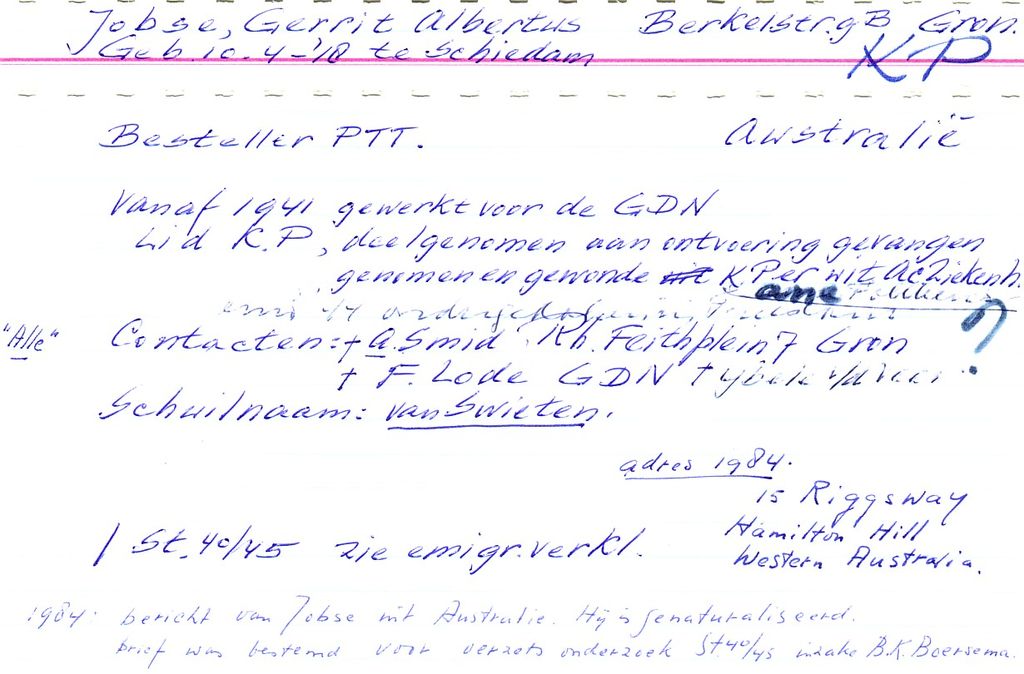 Vluchtte weg toen hij een telexbericht vernam waarin zijn arrestatie werd gelast. Werd door collega Jan Flikkema neergeschoten, 10-06-1943. Is uit het Academisch Ziekenhuis bevrijd door de KP Meppel, 16-06-1943. Viel later toen hij in het RK ziekenhuis van Apeldoorn lag weer in Duitse handen, 16-08-1943