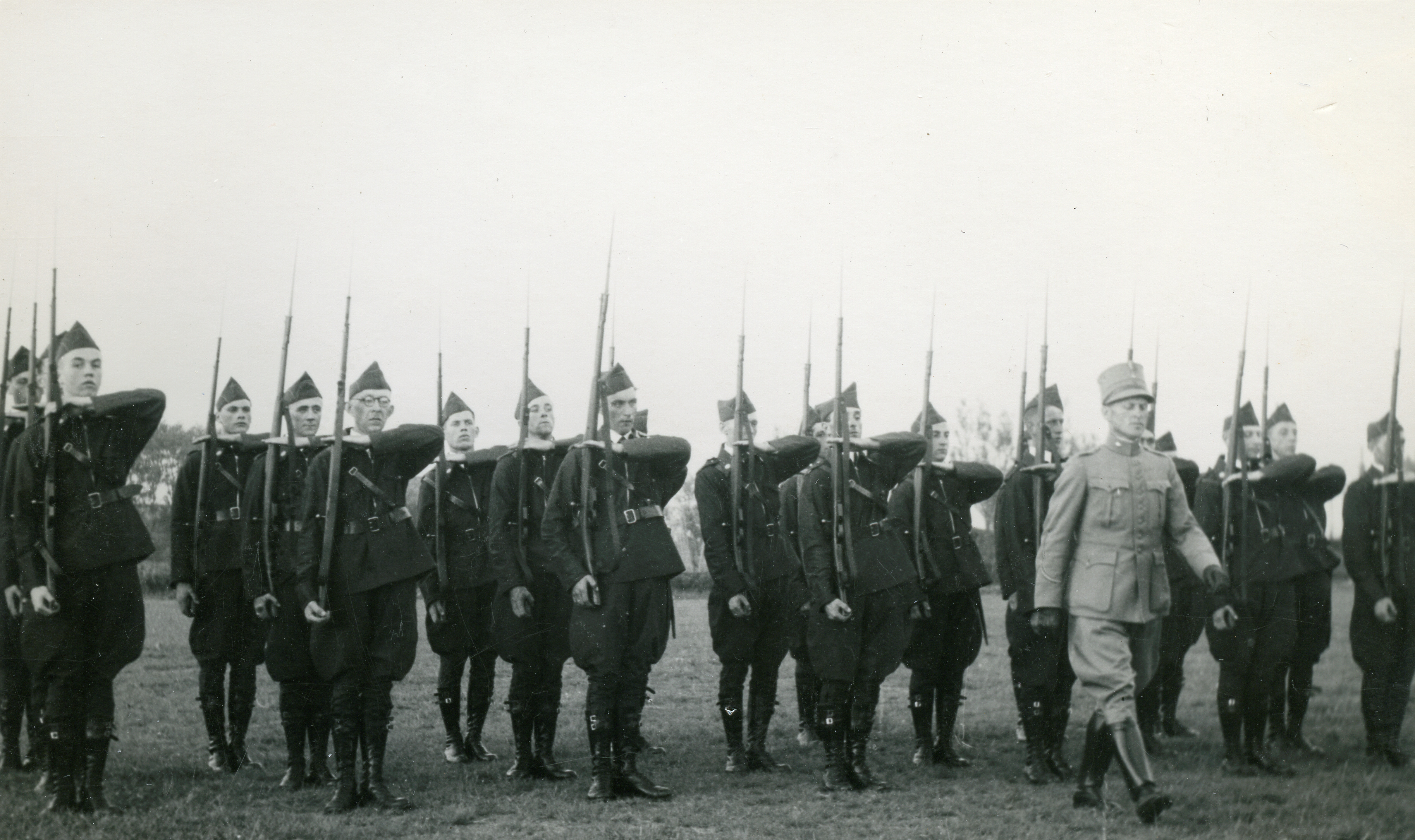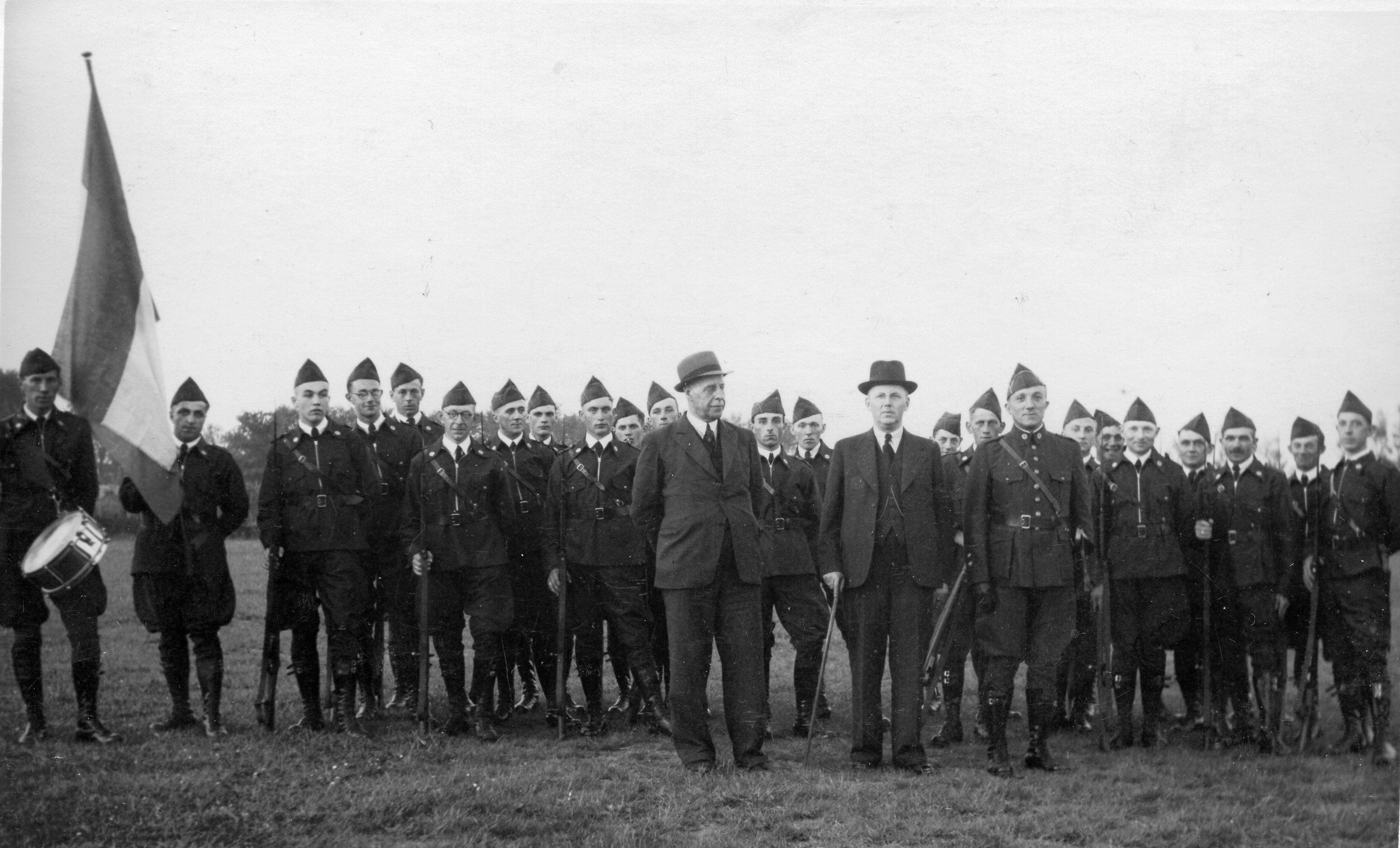 Leeuwarder Burgerwacht. Derde van links: H. v.d. Veen Jr. (banketbakker); rechter rij: H. v.d. Veen (broer, banketbakker Tuinen); daarachter: Chris Veldhuis; daarachter: Jantje de Boer (lange); in het midden: Ds. J. Zelle.