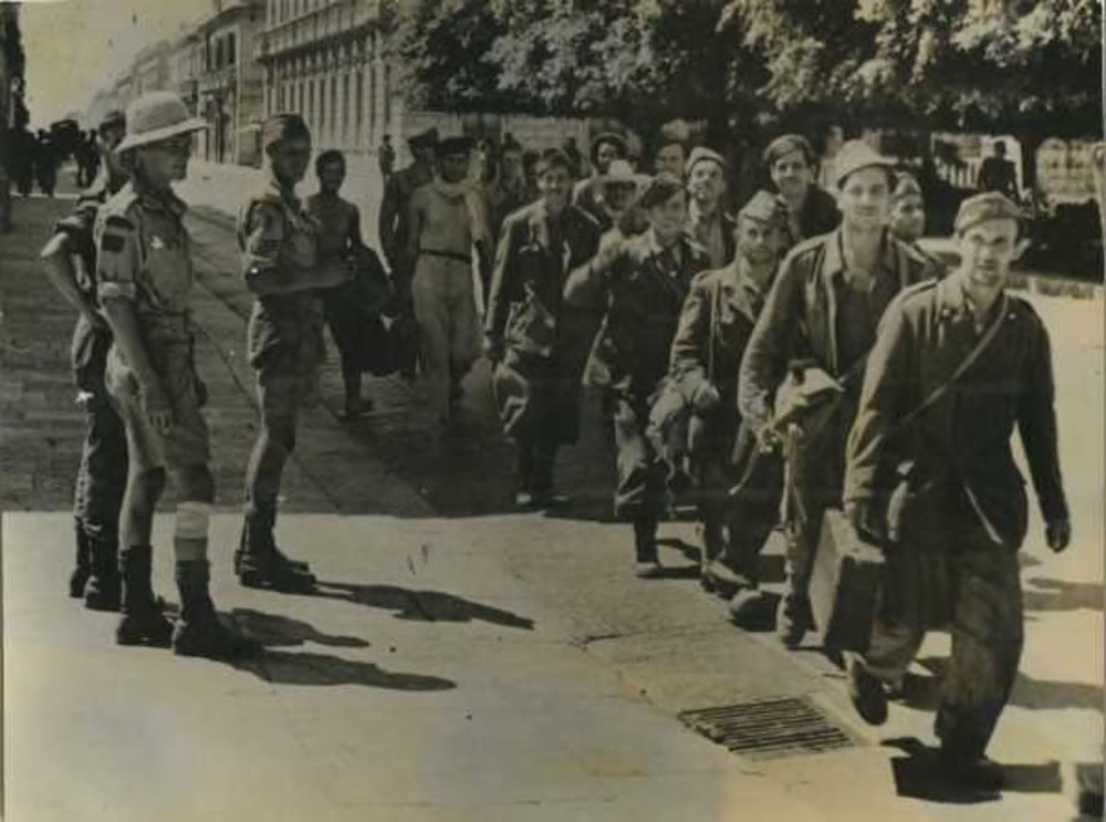 Foto: Mussert loopt langs een groepje leden van de NJS die de NSB groet 'Houzee' brengen.