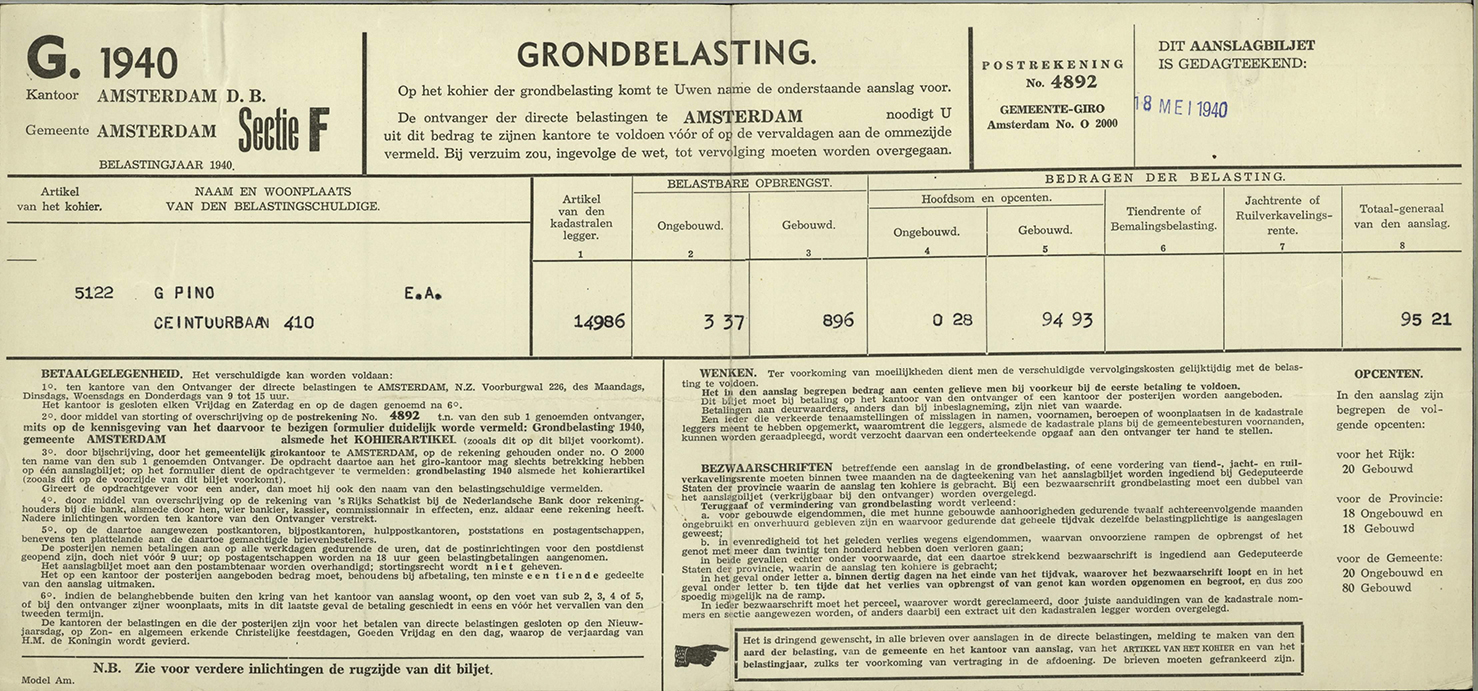Veelkleurig gedrukt eigendomsbewijs van postduif. Daarop gestileerde duiven in vlucht en zittend, tevens Nederlands rijkswapen en registratienummer.