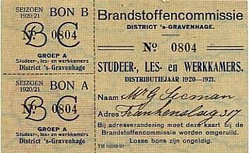 Een blauwgrijze brandstoffenkaart van M.G. Sieman, Frankenslag 317. De Studeer-, Les- en Werkkamerskaart No. 0804 heeft aan beide zijden van de adressering twee - Seizoen 1920/21 Groep A - bonnen (BON A, B, C en D).