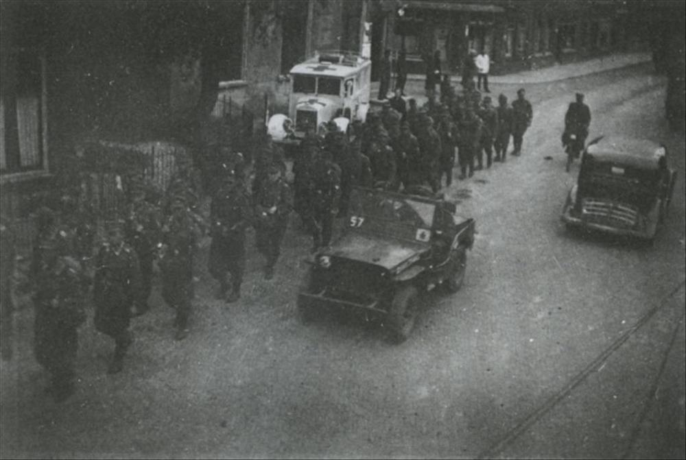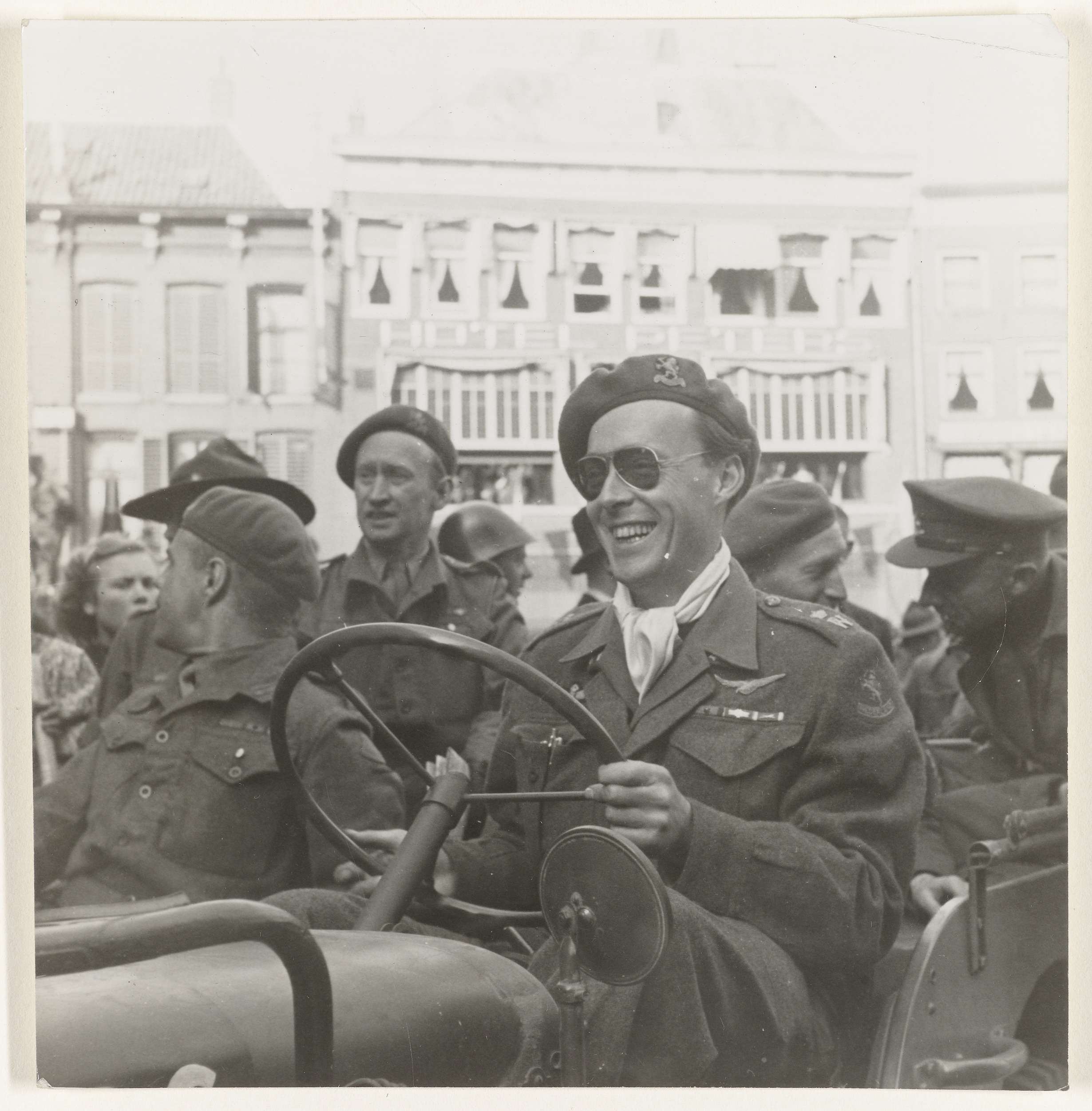 Amerikaanse militair op jeep met jong meisje op schoot, jongetje op klompen staat op de motorkap van de jeep, andere jongetje speelt rechts van de jeepGelderland in 100 foto's beschrijft deze foto als: Een Amerikaanse soldaat van de 82nd Airborne Division maakt contact met Nederlandse kinderen aan de Rijksweg, bij de ingang van het dorp vanuit Nijmegen.