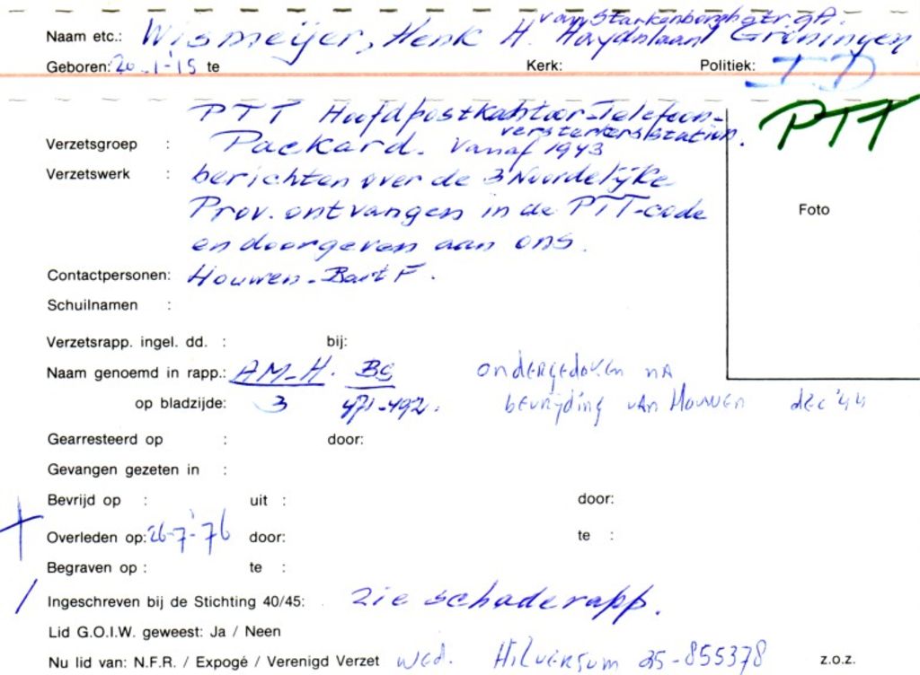 December '44 ondergedoken na de bevrijding van Houwen. Volgens het rapport Deinum was er 1944-11-18 een overval op de woning van betrokkene waarbij hij wist te ontkomen