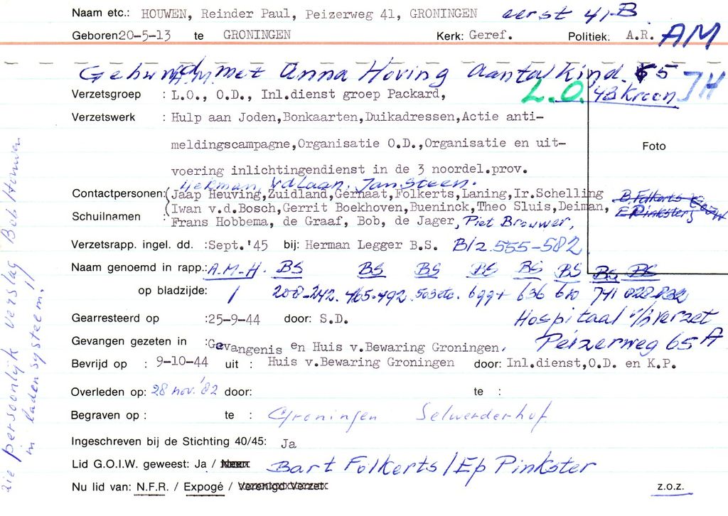 Begin '42 gearresteerd en door mr Haverkamp verdedigd, goed teruggekomen, zie verslag van Houwen in de map Groningen