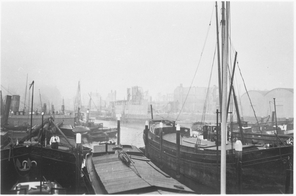 Haven Rotterdam tijdens bombardement. Foto uit fotoalbum, genomen vanaf Noordereiland, Maaskade. In het midden de Oude Haven, links Witte Huis, rechts de Oosterkade.