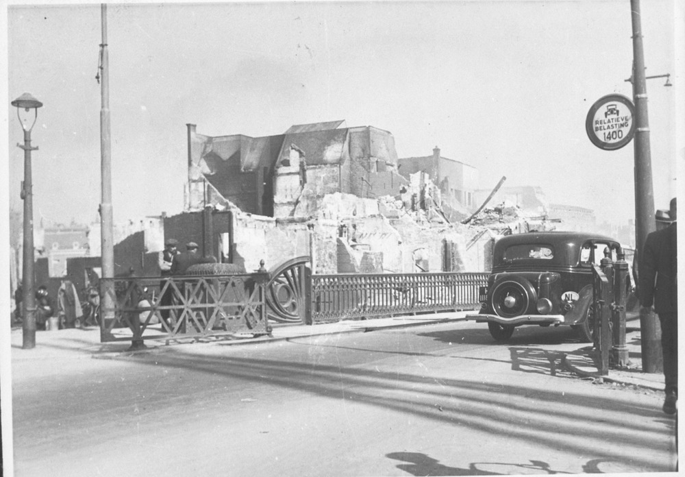 Haven Rotterdam tijdens bombardement. Foto uit fotoalbum, genomen vanaf Noordereiland, Maaskade.