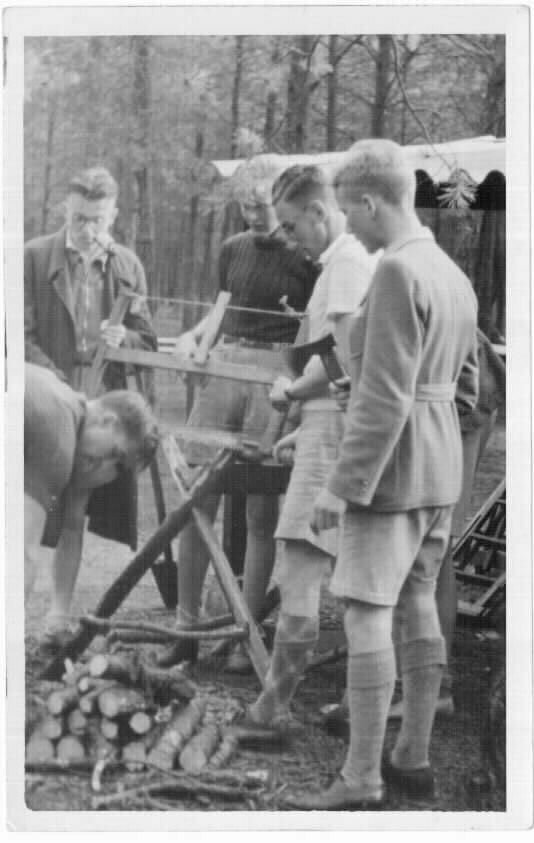 Kamp Zegenwerp van de Schiedamse Gymnasiastenbond. Van links naar rechts: Con Buschman, Joop Anceaux (met pijp), Goof Bloemendaal, Cor Heijboer en NN.