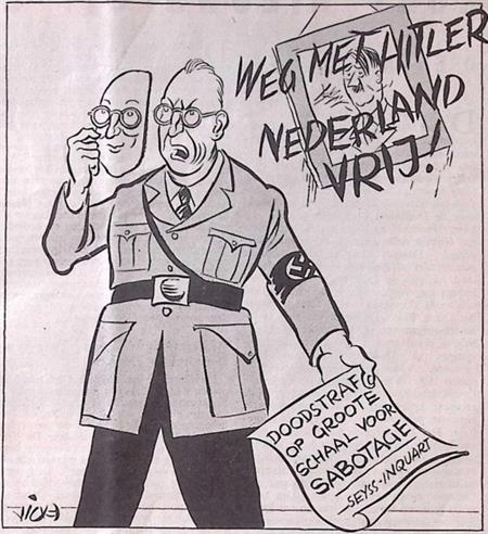 Getoond op deze prent is Adolf Hitler. Adolf Hitler was een Duitse politicus die van 1934 tot 1945 de rol van staatshoofd van Duitsland vervulde. Het symbool van de swastika, afkomstig uit de Indusbeschaving, is terug te vinden in diverse Euraziatische culturen en werd door Hitler en de nazi's als hakenkruis ingezet.Vrij Nederland - Sabotage in Nederland.De prent bevat de volgende tekst: 'Weg met Hitler ...