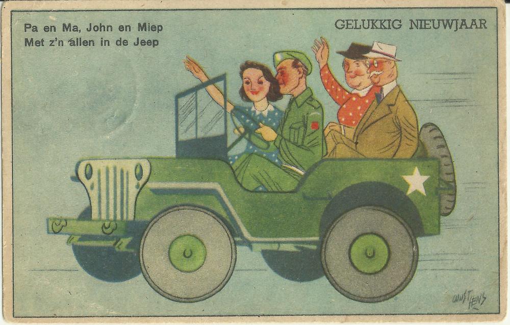 Pa en Ma, John en Miep - Met z'n allen in de Jeep. "serie van 3 kaarten, op iedere kaart twee verschillende teksten. Op de tweede kaart staat de tekst "gelukkig nieuwjaar" "de kaarten zijn gemaakt door August-Frans ( Guust ) Hens - illustrator" "op de achterkant van de kaart: aan mej de Vroet - met een postzegel van anderhalve cent" "1945"