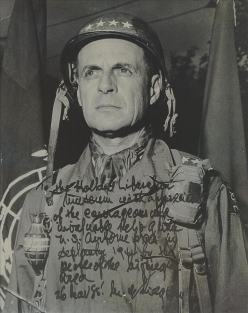 Matthey Ridgeway, 82nd Airborne Div., gesigneerd voor Gavin 'to the Holland Liberation Museum with appreciaion of the courageous ..... invaluable help ....... U.S. Airborne .... September 19th by the people of the ....... area 26 .... 85! ... Ridgway