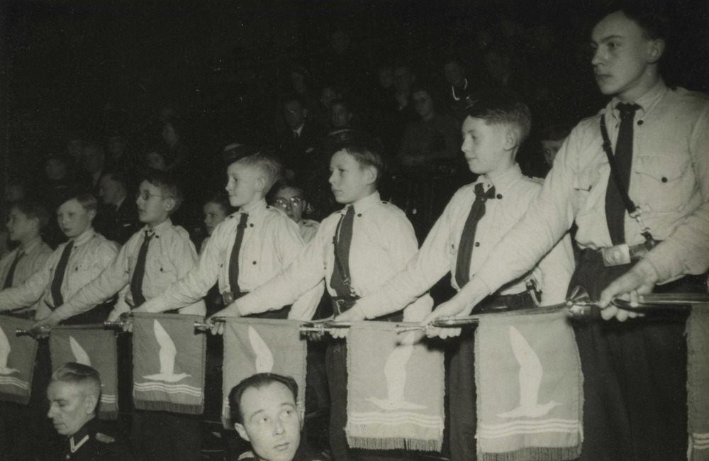 Keuzeconcert van de Nederlandsche Volksdienst, NVD, in het concertgebouw. Foto: leden van de Nationale Jeugdstorm.